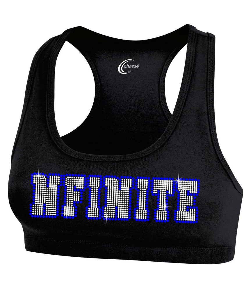 NFINITE OC Chasse Black Raceback Sports Bra w/ NFINITE Spangle Logo on Front.