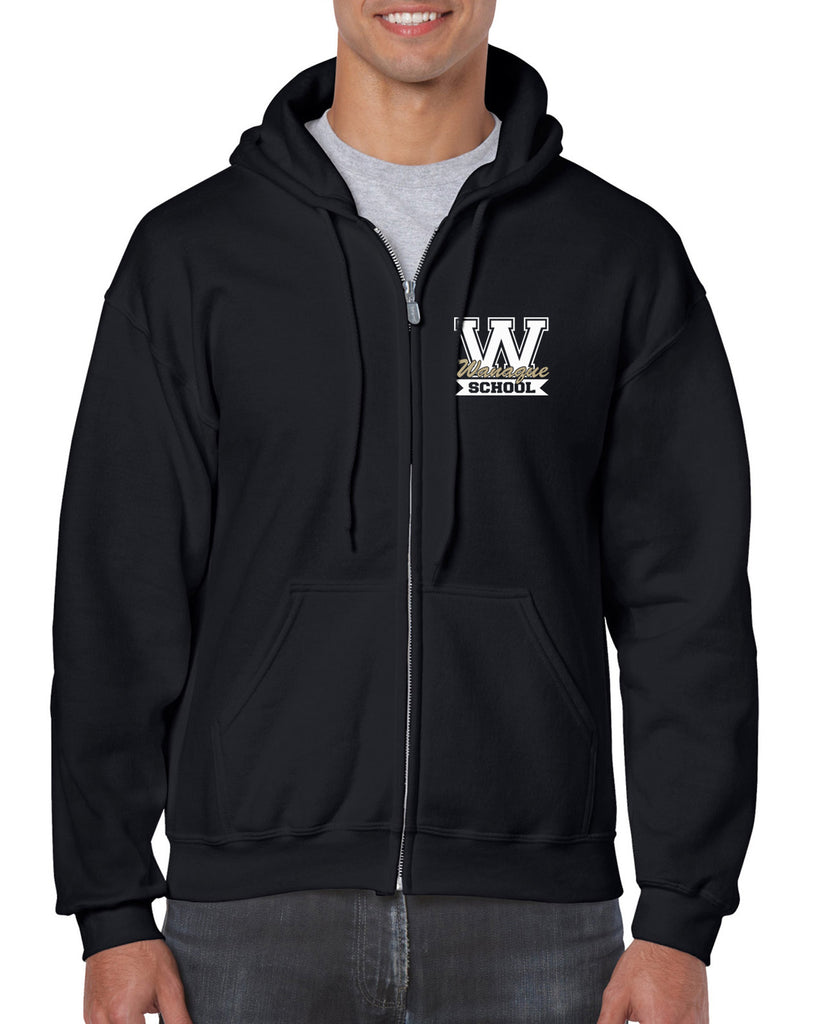 WANAQUE School Black Heavy Blend FULL-ZIP Hoodie w/ Small WANAQUE School "W" 2 color Logo on Front Left Chest.