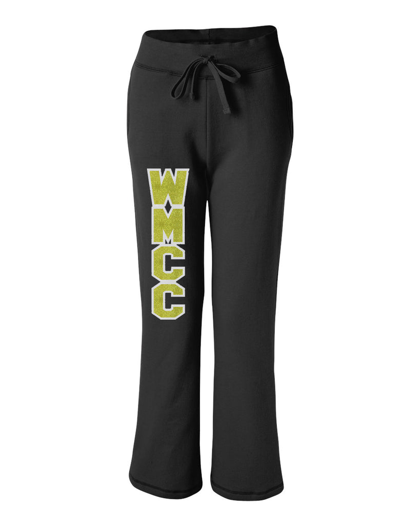 WMCC Black Ladies Sweat Pants w/ Gold & White Glitter Print Logo down Leg.