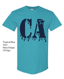 Cheer Army Tropical Blue Short Sleeve Tee w/ Navy CA Drip Design on Front.