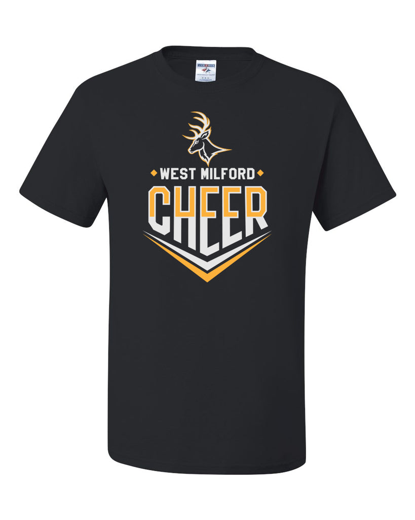 West Milford Cheerleading - Black Short Sleeve Tee w/ WM Cheer Deer Design on Front.