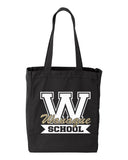 Wanaque School Black 10 Ounce Gusseted Cotton Canvas Tote w/ Wanaque School "W" Logo on Front.