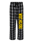 West Milford Fencing Black & White Flannel PJ Style Pants w/ Black & Athletic Gold Print down Leg.